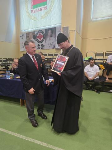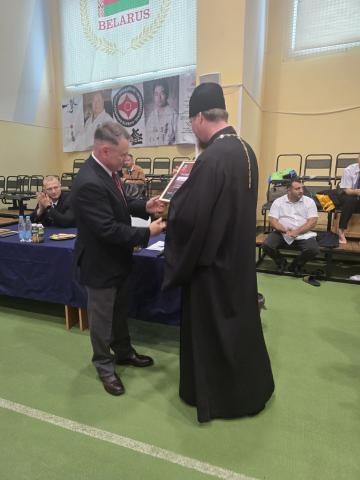 Церемония открытия началась с приветственного слова председателя правления ОО БРФК «ИКО» Василия Викторовича Максимова. Затем право обратиться к собравшимся было предоставлено ключарю архиерейского подворья прихода храма Собора Белорусских святых иерею Евгению Ковалю.
