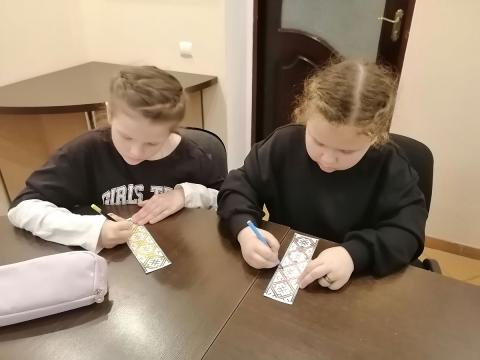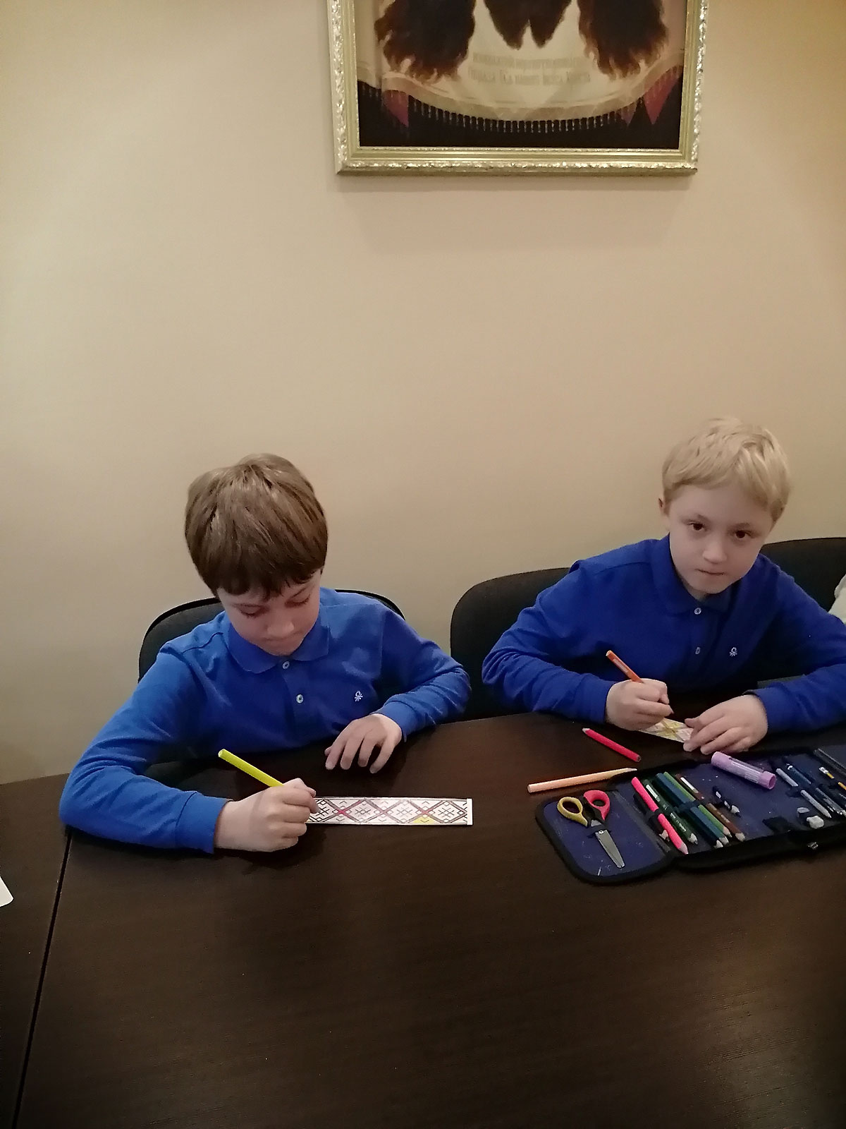 Далее в качестве рефлексии ребятам была предложена творческая работа, которая заключалась в раскрашивании фрагмента пояса. По её завершении все фрагменты были склеены в один длинный пояс, который символично напоминал о святыне, с которой познакомились и имели возможность приложиться.